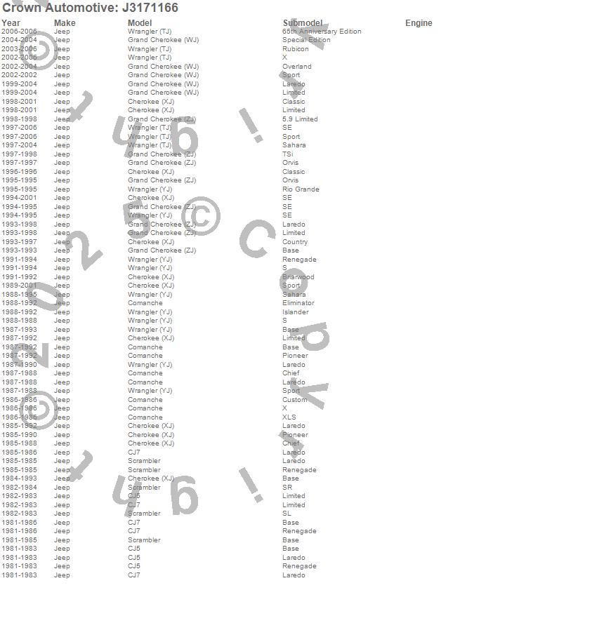 Crown Automotive is the premier manufacturer and distributor of quality replacement parts for Jeep® CJ™, Wrangler™, Cherokee™, Grand Cherokee™, Liberty™, and Commander™."From humble beginnings in 1963 in a small Boston storefront, Crown Automotive has consistently maintained its commitment to offering only quality parts and exceptional service. Today, with warehouses in Massachusetts, Georgia, Nevada, Spain, and the Czech Republic, totaling over 160,000 square feet, Crown Automotive continues to be the leader in quality replacement parts for Jeep® vehicles. With over 8,000 different parts in stock for Jeep® vehicles from 1942 on up, Crown has the largest stock of replacement parts for Jeep® vehicles, including factory-discontinued parts. In fact, many of the older Jeeps are still on (and off) the road thanks to Crown parts. The Crown line consists of axle, body, brake, clutch, cooling, driveline, electrical, engine, exhaust, fuel, steering, suspension, transmission and transfer case components. Crown Automotive also offers an exclusive line of component kits and accessory products. Because we know that Jeeps are driven harder than most other vehicles, we emphasize offering only quality parts. In fact, we test parts on Jeeps before distributing them to our dealers to insure that they meet our standards for quality. Crown also supports its entire line with a 12 month/12,000 mile warranty to insure our dealers and their customers of our commitment to offering quality parts. We know from experience that Jeep® owners would rather pay a little more for a good quality part that's backed by a strong guarantee. But we know that price is important as well. So, not only will you find Crown parts to be of exceptional quality, but you'll find them at a great price too.
