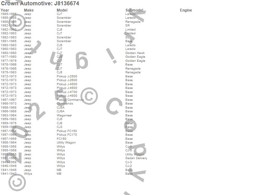 Crown Automotive is the premier manufacturer and distributor of quality replacement parts for Jeep® CJ™, Wrangler™, Cherokee™, Grand Cherokee™, Liberty™, and Commander™."From humble beginnings in 1963 in a small Boston storefront, Crown Automotive has consistently maintained its commitment to offering only quality parts and exceptional service. Today, with warehouses in Massachusetts, Georgia, Nevada, Spain, and the Czech Republic, totaling over 160,000 square feet, Crown Automotive continues to be the leader in quality replacement parts for Jeep® vehicles. With over 8,000 different parts in stock for Jeep® vehicles from 1942 on up, Crown has the largest stock of replacement parts for Jeep® vehicles, including factory-discontinued parts. In fact, many of the older Jeeps are still on (and off) the road thanks to Crown parts. The Crown line consists of axle, body, brake, clutch, cooling, driveline, electrical, engine, exhaust, fuel, steering, suspension, transmission and transfer case components. Crown Automotive also offers an exclusive line of component kits and accessory products. Because we know that Jeeps are driven harder than most other vehicles, we emphasize offering only quality parts. In fact, we test parts on Jeeps before distributing them to our dealers to insure that they meet our standards for quality. Crown also supports its entire line with a 12 month/12,000 mile warranty to insure our dealers and their customers of our commitment to offering quality parts. We know from experience that Jeep® owners would rather pay a little more for a good quality part that's backed by a strong guarantee. But we know that price is important as well. So, not only will you find Crown parts to be of exceptional quality, but you'll find them at a great price too.