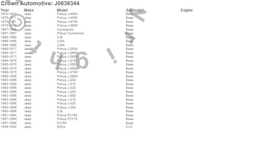 Crown Automotive is the premier manufacturer and distributor of quality replacement parts for Jeep® CJ™, Wrangler™, Cherokee™, Grand Cherokee™, Liberty™, and Commander™."From humble beginnings in 1963 in a small Boston storefront, Crown Automotive has consistently maintained its commitment to offering only quality parts and exceptional service. Today, with warehouses in Massachusetts, Georgia, Nevada, Spain, and the Czech Republic, totaling over 160,000 square feet, Crown Automotive continues to be the leader in quality replacement parts for Jeep® vehicles. With over 8,000 different parts in stock for Jeep® vehicles from 1942 on up, Crown has the largest stock of replacement parts for Jeep® vehicles, including factory-discontinued parts. In fact, many of the older Jeeps are still on (and off) the road thanks to Crown parts. The Crown line consists of axle, body, brake, clutch, cooling, driveline, electrical, engine, exhaust, fuel, steering, suspension, transmission and transfer case components. Crown Automotive also offers an exclusive line of component kits and accessory products. Because we know that Jeeps are driven harder than most other vehicles, we emphasize offering only quality parts. In fact, we test parts on Jeeps before distributing them to our dealers to insure that they meet our standards for quality. Crown also supports its entire line with a 12 month/12,000 mile warranty to insure our dealers and their customers of our commitment to offering quality parts. We know from experience that Jeep® owners would rather pay a little more for a good quality part that's backed by a strong guarantee. But we know that price is important as well. So, not only will you find Crown parts to be of exceptional quality, but you'll find them at a great price too.