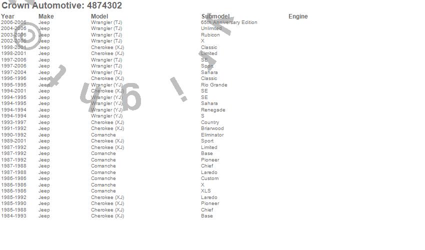 Crown Automotive is the premier manufacturer and distributor of quality replacement parts for Jeep® CJ™, Wrangler™, Cherokee™, Grand Cherokee™, Liberty™, and Commander™."From humble beginnings in 1963 in a small Boston storefront, Crown Automotive has consistently maintained its commitment to offering only quality parts and exceptional service. Today, with warehouses in Massachusetts, Georgia, Nevada, Spain, and the Czech Republic, totaling over 160,000 square feet, Crown Automotive continues to be the leader in quality replacement parts for Jeep® vehicles. With over 8,000 different parts in stock for Jeep® vehicles from 1942 on up, Crown has the largest stock of replacement parts for Jeep® vehicles, including factory-discontinued parts. In fact, many of the older Jeeps are still on (and off) the road thanks to Crown parts. The Crown line consists of axle, body, brake, clutch, cooling, driveline, electrical, engine, exhaust, fuel, steering, suspension, transmission and transfer case components. Crown Automotive also offers an exclusive line of component kits and accessory products. Because we know that Jeeps are driven harder than most other vehicles, we emphasize offering only quality parts. In fact, we test parts on Jeeps before distributing them to our dealers to insure that they meet our standards for quality. Crown also supports its entire line with a 12 month/12,000 mile warranty to insure our dealers and their customers of our commitment to offering quality parts. We know from experience that Jeep® owners would rather pay a little more for a good quality part that's backed by a strong guarantee. But we know that price is important as well. So, not only will you find Crown parts to be of exceptional quality, but you'll find them at a great price too.