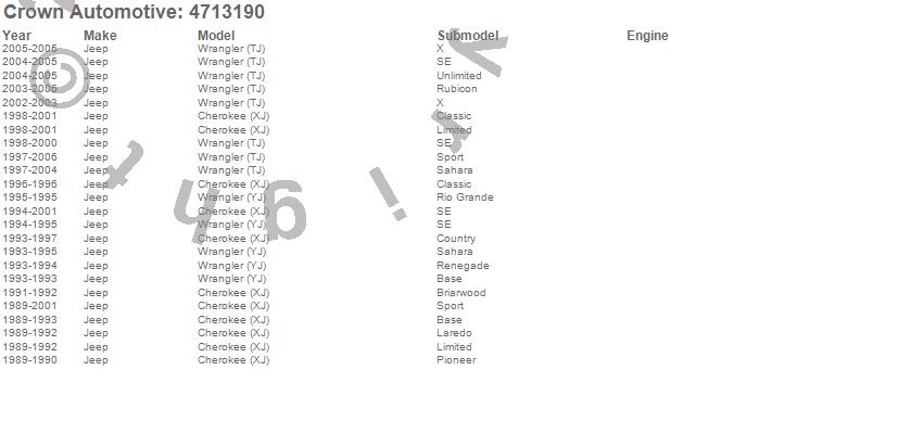 Crown Automotive is the premier manufacturer and distributor of quality replacement parts for Jeep® CJ™, Wrangler™, Cherokee™, Grand Cherokee™, Liberty™, and Commander™."From humble beginnings in 1963 in a small Boston storefront, Crown Automotive has consistently maintained its commitment to offering only quality parts and exceptional service. Today, with warehouses in Massachusetts, Georgia, Nevada, Spain, and the Czech Republic, totaling over 160,000 square feet, Crown Automotive continues to be the leader in quality replacement parts for Jeep® vehicles. With over 8,000 different parts in stock for Jeep® vehicles from 1942 on up, Crown has the largest stock of replacement parts for Jeep® vehicles, including factory-discontinued parts. In fact, many of the older Jeeps are still on (and off) the road thanks to Crown parts. The Crown line consists of axle, body, brake, clutch, cooling, driveline, electrical, engine, exhaust, fuel, steering, suspension, transmission and transfer case components. Crown Automotive also offers an exclusive line of component kits and accessory products. Because we know that Jeeps are driven harder than most other vehicles, we emphasize offering only quality parts. In fact, we test parts on Jeeps before distributing them to our dealers to insure that they meet our standards for quality. Crown also supports its entire line with a 12 month/12,000 mile warranty to insure our dealers and their customers of our commitment to offering quality parts. We know from experience that Jeep® owners would rather pay a little more for a good quality part that's backed by a strong guarantee. But we know that price is important as well. So, not only will you find Crown parts to be of exceptional quality, but you'll find them at a great price too.