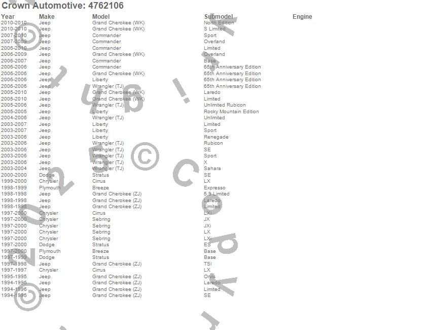 Breeze, Cirrus, Commander, Grand Cherokee (WK), Grand Cherokee (ZJ), Liberty, Sebring, Stratus, Wrangler (LJ), Wrangler (TJ), Chrysler, Dodge, Jeep, Plymouth, 2010, 2009, 2008, 2007, 2006, 2005 more…