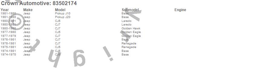 Crown Automotive is the premier manufacturer and distributor of quality replacement parts for Jeep® CJ™, Wrangler™, Cherokee™, Grand Cherokee™, Liberty™, and Commander™."From humble beginnings in 1963 in a small Boston storefront, Crown Automotive has consistently maintained its commitment to offering only quality parts and exceptional service. Today, with warehouses in Massachusetts, Georgia, Nevada, Spain, and the Czech Republic, totaling over 160,000 square feet, Crown Automotive continues to be the leader in quality replacement parts for Jeep® vehicles. With over 8,000 different parts in stock for Jeep® vehicles from 1942 on up, Crown has the largest stock of replacement parts for Jeep® vehicles, including factory-discontinued parts. In fact, many of the older Jeeps are still on (and off) the road thanks to Crown parts. The Crown line consists of axle, body, brake, clutch, cooling, driveline, electrical, engine, exhaust, fuel, steering, suspension, transmission and transfer case components. Crown Automotive also offers an exclusive line of component kits and accessory products. Because we know that Jeeps are driven harder than most other vehicles, we emphasize offering only quality parts. In fact, we test parts on Jeeps before distributing them to our dealers to insure that they meet our standards for quality. Crown also supports its entire line with a 12 month/12,000 mile warranty to insure our dealers and their customers of our commitment to offering quality parts. We know from experience that Jeep® owners would rather pay a little more for a good quality part that's backed by a strong guarantee. But we know that price is important as well. So, not only will you find Crown parts to be of exceptional quality, but you'll find them at a great price too.