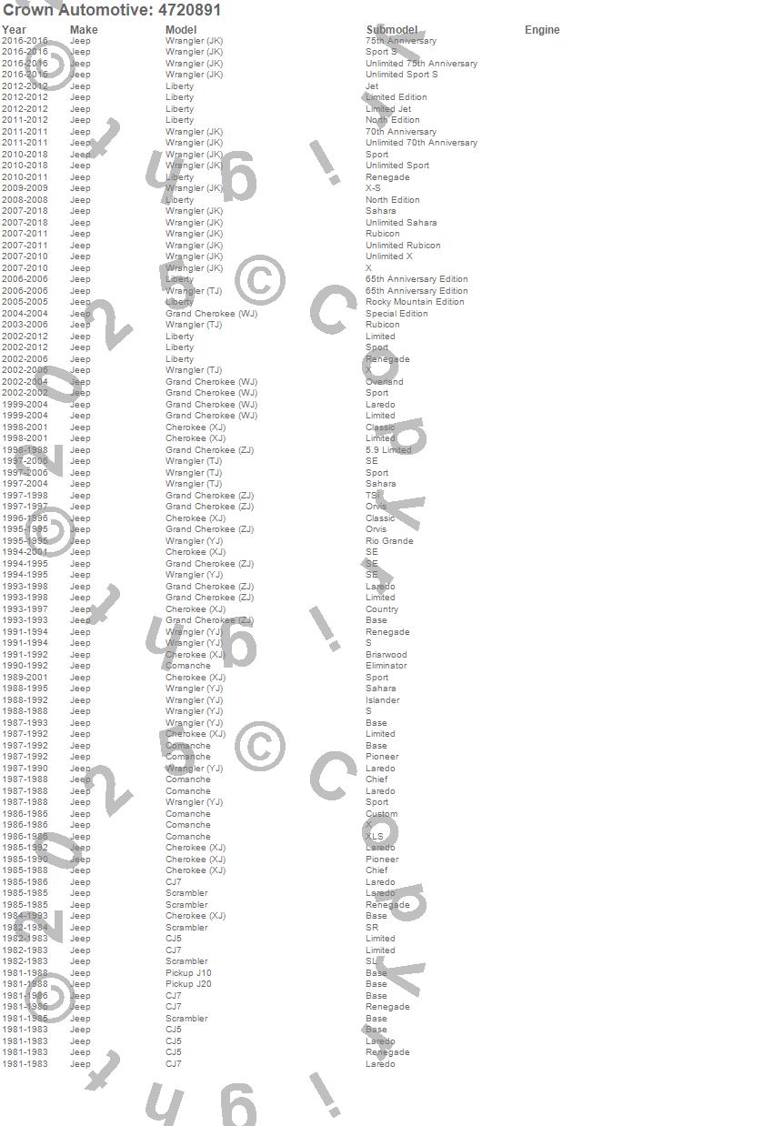 Crown Automotive is the premier manufacturer and distributor of quality replacement parts for Jeep® CJ™, Wrangler™, Cherokee™, Grand Cherokee™, Liberty™, and Commander™."From humble beginnings in 1963 in a small Boston storefront, Crown Automotive has consistently maintained its commitment to offering only quality parts and exceptional service. Today, with warehouses in Massachusetts, Georgia, Nevada, Spain, and the Czech Republic, totaling over 160,000 square feet, Crown Automotive continues to be the leader in quality replacement parts for Jeep® vehicles. With over 8,000 different parts in stock for Jeep® vehicles from 1942 on up, Crown has the largest stock of replacement parts for Jeep® vehicles, including factory-discontinued parts. In fact, many of the older Jeeps are still on (and off) the road thanks to Crown parts. The Crown line consists of axle, body, brake, clutch, cooling, driveline, electrical, engine, exhaust, fuel, steering, suspension, transmission and transfer case components. Crown Automotive also offers an exclusive line of component kits and accessory products. Because we know that Jeeps are driven harder than most other vehicles, we emphasize offering only quality parts. In fact, we test parts on Jeeps before distributing them to our dealers to insure that they meet our standards for quality. Crown also supports its entire line with a 12 month/12,000 mile warranty to insure our dealers and their customers of our commitment to offering quality parts. We know from experience that Jeep® owners would rather pay a little more for a good quality part that's backed by a strong guarantee. But we know that price is important as well. So, not only will you find Crown parts to be of exceptional quality, but you'll find them at a great price too.