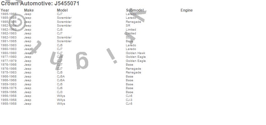 Crown Automotive is the premier manufacturer and distributor of quality replacement parts for Jeep® CJ™, Wrangler™, Cherokee™, Grand Cherokee™, Liberty™, and Commander™."From humble beginnings in 1963 in a small Boston storefront, Crown Automotive has consistently maintained its commitment to offering only quality parts and exceptional service. Today, with warehouses in Massachusetts, Georgia, Nevada, Spain, and the Czech Republic, totaling over 160,000 square feet, Crown Automotive continues to be the leader in quality replacement parts for Jeep® vehicles. With over 8,000 different parts in stock for Jeep® vehicles from 1942 on up, Crown has the largest stock of replacement parts for Jeep® vehicles, including factory-discontinued parts. In fact, many of the older Jeeps are still on (and off) the road thanks to Crown parts. The Crown line consists of axle, body, brake, clutch, cooling, driveline, electrical, engine, exhaust, fuel, steering, suspension, transmission and transfer case components. Crown Automotive also offers an exclusive line of component kits and accessory products. Because we know that Jeeps are driven harder than most other vehicles, we emphasize offering only quality parts. In fact, we test parts on Jeeps before distributing them to our dealers to insure that they meet our standards for quality. Crown also supports its entire line with a 12 month/12,000 mile warranty to insure our dealers and their customers of our commitment to offering quality parts. We know from experience that Jeep® owners would rather pay a little more for a good quality part that's backed by a strong guarantee. But we know that price is important as well. So, not only will you find Crown parts to be of exceptional quality, but you'll find them at a great price too.