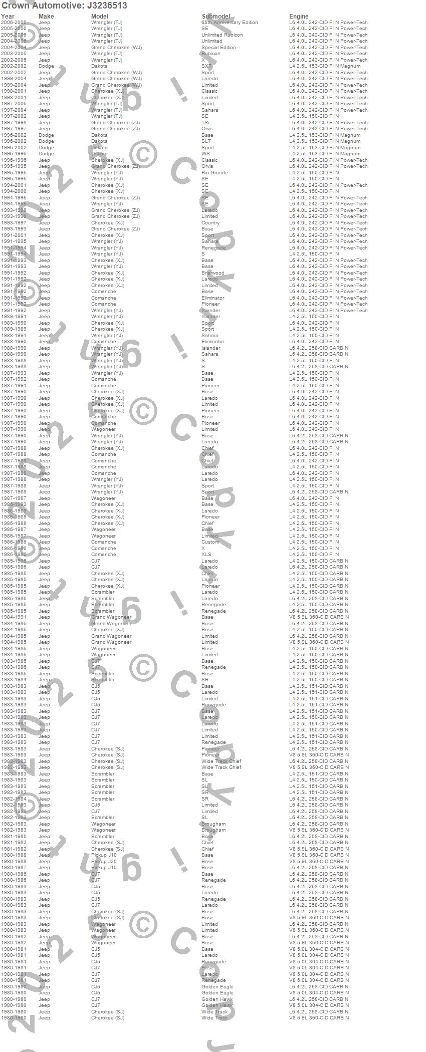 Cherokee (SJ), Cherokee (XJ), CJ5, CJ7, Comanche, Dakota, Grand Cherokee (WJ), Grand Cherokee (ZJ), Grand Wagoneer, J10, J20, Scrambler, Wagoneer, Wrangler (LJ), Wrangler (TJ), Wrangler (YJ), Dodge, Jeep, 2006, 2005 more…