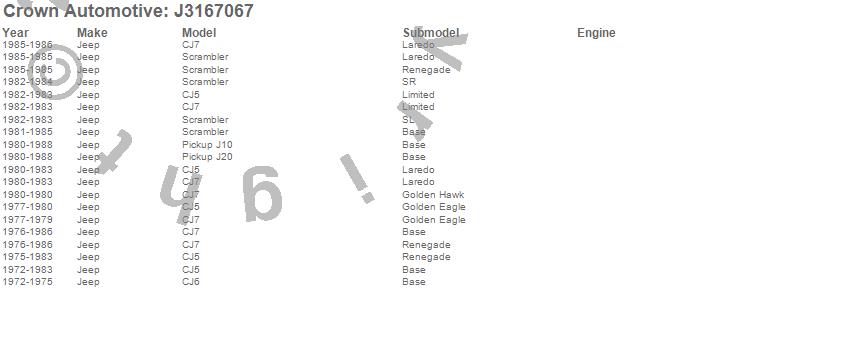 Crown Automotive is the premier manufacturer and distributor of quality replacement parts for Jeep® CJ™, Wrangler™, Cherokee™, Grand Cherokee™, Liberty™, and Commander™."From humble beginnings in 1963 in a small Boston storefront, Crown Automotive has consistently maintained its commitment to offering only quality parts and exceptional service. Today, with warehouses in Massachusetts, Georgia, Nevada, Spain, and the Czech Republic, totaling over 160,000 square feet, Crown Automotive continues to be the leader in quality replacement parts for Jeep® vehicles. With over 8,000 different parts in stock for Jeep® vehicles from 1942 on up, Crown has the largest stock of replacement parts for Jeep® vehicles, including factory-discontinued parts. In fact, many of the older Jeeps are still on (and off) the road thanks to Crown parts. The Crown line consists of axle, body, brake, clutch, cooling, driveline, electrical, engine, exhaust, fuel, steering, suspension, transmission and transfer case components. Crown Automotive also offers an exclusive line of component kits and accessory products. Because we know that Jeeps are driven harder than most other vehicles, we emphasize offering only quality parts. In fact, we test parts on Jeeps before distributing them to our dealers to insure that they meet our standards for quality. Crown also supports its entire line with a 12 month/12,000 mile warranty to insure our dealers and their customers of our commitment to offering quality parts. We know from experience that Jeep® owners would rather pay a little more for a good quality part that's backed by a strong guarantee. But we know that price is important as well. So, not only will you find Crown parts to be of exceptional quality, but you'll find them at a great price too.
