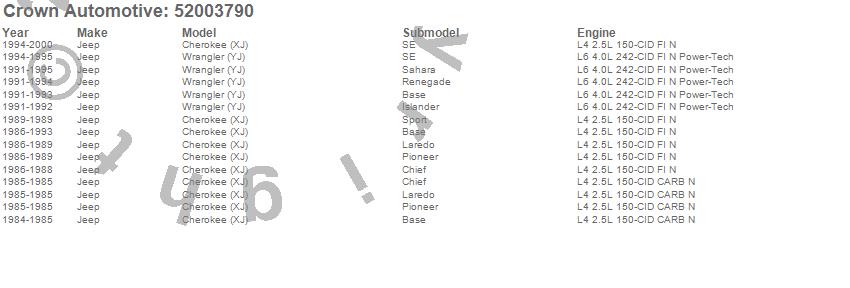 Cherokee (XJ), Wrangler (YJ), Jeep, 2000, 1999, 1998, 1997, 1996, 1995, 1994, 1993, 1992, 1991, 1990, 1989, 1988, 1987, 1986, 1985, 1984 more…