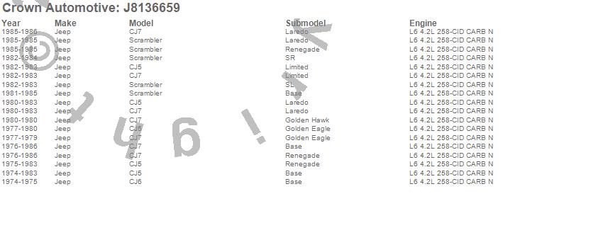 Crown Automotive is the premier manufacturer and distributor of quality replacement parts for Jeep® CJ™, Wrangler™, Cherokee™, Grand Cherokee™, Liberty™, and Commander™."From humble beginnings in 1963 in a small Boston storefront, Crown Automotive has consistently maintained its commitment to offering only quality parts and exceptional service. Today, with warehouses in Massachusetts, Georgia, Nevada, Spain, and the Czech Republic, totaling over 160,000 square feet, Crown Automotive continues to be the leader in quality replacement parts for Jeep® vehicles. With over 8,000 different parts in stock for Jeep® vehicles from 1942 on up, Crown has the largest stock of replacement parts for Jeep® vehicles, including factory-discontinued parts. In fact, many of the older Jeeps are still on (and off) the road thanks to Crown parts. The Crown line consists of axle, body, brake, clutch, cooling, driveline, electrical, engine, exhaust, fuel, steering, suspension, transmission and transfer case components. Crown Automotive also offers an exclusive line of component kits and accessory products. Because we know that Jeeps are driven harder than most other vehicles, we emphasize offering only quality parts. In fact, we test parts on Jeeps before distributing them to our dealers to insure that they meet our standards for quality. Crown also supports its entire line with a 12 month/12,000 mile warranty to insure our dealers and their customers of our commitment to offering quality parts. We know from experience that Jeep® owners would rather pay a little more for a good quality part that's backed by a strong guarantee. But we know that price is important as well. So, not only will you find Crown parts to be of exceptional quality, but you'll find them at a great price too.