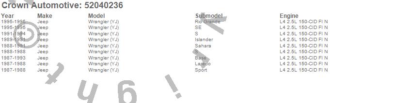 Crown Automotive is the premier manufacturer and distributor of quality replacement parts for Jeep® CJ™, Wrangler™, Cherokee™, Grand Cherokee™, Liberty™, and Commander™."From humble beginnings in 1963 in a small Boston storefront, Crown Automotive has consistently maintained its commitment to offering only quality parts and exceptional service. Today, with warehouses in Massachusetts, Georgia, Nevada, Spain, and the Czech Republic, totaling over 160,000 square feet, Crown Automotive continues to be the leader in quality replacement parts for Jeep® vehicles. With over 8,000 different parts in stock for Jeep® vehicles from 1942 on up, Crown has the largest stock of replacement parts for Jeep® vehicles, including factory-discontinued parts. In fact, many of the older Jeeps are still on (and off) the road thanks to Crown parts. The Crown line consists of axle, body, brake, clutch, cooling, driveline, electrical, engine, exhaust, fuel, steering, suspension, transmission and transfer case components. Crown Automotive also offers an exclusive line of component kits and accessory products. Because we know that Jeeps are driven harder than most other vehicles, we emphasize offering only quality parts. In fact, we test parts on Jeeps before distributing them to our dealers to insure that they meet our standards for quality. Crown also supports its entire line with a 12 month/12,000 mile warranty to insure our dealers and their customers of our commitment to offering quality parts. We know from experience that Jeep® owners would rather pay a little more for a good quality part that's backed by a strong guarantee. But we know that price is important as well. So, not only will you find Crown parts to be of exceptional quality, but you'll find them at a great price too.