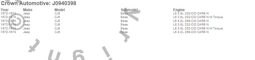 Crown Automotive is the premier manufacturer and distributor of quality replacement parts for Jeep® CJ™, Wrangler™, Cherokee™, Grand Cherokee™, Liberty™, and Commander™."From humble beginnings in 1963 in a small Boston storefront, Crown Automotive has consistently maintained its commitment to offering only quality parts and exceptional service. Today, with warehouses in Massachusetts, Georgia, Nevada, Spain, and the Czech Republic, totaling over 160,000 square feet, Crown Automotive continues to be the leader in quality replacement parts for Jeep® vehicles. With over 8,000 different parts in stock for Jeep® vehicles from 1942 on up, Crown has the largest stock of replacement parts for Jeep® vehicles, including factory-discontinued parts. In fact, many of the older Jeeps are still on (and off) the road thanks to Crown parts. The Crown line consists of axle, body, brake, clutch, cooling, driveline, electrical, engine, exhaust, fuel, steering, suspension, transmission and transfer case components. Crown Automotive also offers an exclusive line of component kits and accessory products. Because we know that Jeeps are driven harder than most other vehicles, we emphasize offering only quality parts. In fact, we test parts on Jeeps before distributing them to our dealers to insure that they meet our standards for quality. Crown also supports its entire line with a 12 month/12,000 mile warranty to insure our dealers and their customers of our commitment to offering quality parts. We know from experience that Jeep® owners would rather pay a little more for a good quality part that's backed by a strong guarantee. But we know that price is important as well. So, not only will you find Crown parts to be of exceptional quality, but you'll find them at a great price too.