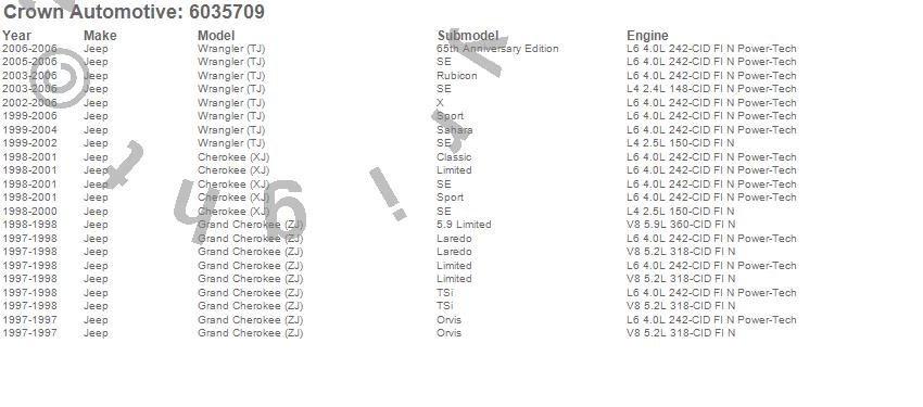Crown Automotive is the premier manufacturer and distributor of quality replacement parts for Jeep® CJ™, Wrangler™, Cherokee™, Grand Cherokee™, Liberty™, and Commander™."From humble beginnings in 1963 in a small Boston storefront, Crown Automotive has consistently maintained its commitment to offering only quality parts and exceptional service. Today, with warehouses in Massachusetts, Georgia, Nevada, Spain, and the Czech Republic, totaling over 160,000 square feet, Crown Automotive continues to be the leader in quality replacement parts for Jeep® vehicles. With over 8,000 different parts in stock for Jeep® vehicles from 1942 on up, Crown has the largest stock of replacement parts for Jeep® vehicles, including factory-discontinued parts. In fact, many of the older Jeeps are still on (and off) the road thanks to Crown parts. The Crown line consists of axle, body, brake, clutch, cooling, driveline, electrical, engine, exhaust, fuel, steering, suspension, transmission and transfer case components. Crown Automotive also offers an exclusive line of component kits and accessory products. Because we know that Jeeps are driven harder than most other vehicles, we emphasize offering only quality parts. In fact, we test parts on Jeeps before distributing them to our dealers to insure that they meet our standards for quality. Crown also supports its entire line with a 12 month/12,000 mile warranty to insure our dealers and their customers of our commitment to offering quality parts. We know from experience that Jeep® owners would rather pay a little more for a good quality part that's backed by a strong guarantee. But we know that price is important as well. So, not only will you find Crown parts to be of exceptional quality, but you'll find them at a great price too.