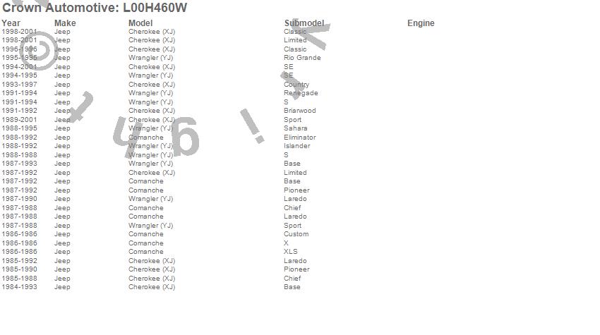 Cherokee (XJ), Comanche, Wrangler (YJ), Jeep, 2001, 2000, 1999, 1998, 1997, 1996, 1995, 1994, 1993, 1992, 1991, 1990, 1989, 1988, 1987, 1986 more…