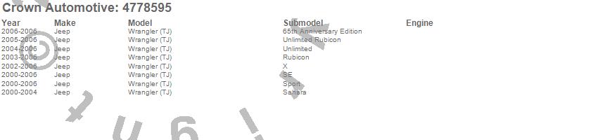 Crown Automotive is the premier manufacturer and distributor of quality replacement parts for Jeep® CJ™, Wrangler™, Cherokee™, Grand Cherokee™, Liberty™, and Commander™."From humble beginnings in 1963 in a small Boston storefront, Crown Automotive has consistently maintained its commitment to offering only quality parts and exceptional service. Today, with warehouses in Massachusetts, Georgia, Nevada, Spain, and the Czech Republic, totaling over 160,000 square feet, Crown Automotive continues to be the leader in quality replacement parts for Jeep® vehicles. With over 8,000 different parts in stock for Jeep® vehicles from 1942 on up, Crown has the largest stock of replacement parts for Jeep® vehicles, including factory-discontinued parts. In fact, many of the older Jeeps are still on (and off) the road thanks to Crown parts. The Crown line consists of axle, body, brake, clutch, cooling, driveline, electrical, engine, exhaust, fuel, steering, suspension, transmission and transfer case components. Crown Automotive also offers an exclusive line of component kits and accessory products. Because we know that Jeeps are driven harder than most other vehicles, we emphasize offering only quality parts. In fact, we test parts on Jeeps before distributing them to our dealers to insure that they meet our standards for quality. Crown also supports its entire line with a 12 month/12,000 mile warranty to insure our dealers and their customers of our commitment to offering quality parts. We know from experience that Jeep® owners would rather pay a little more for a good quality part that's backed by a strong guarantee. But we know that price is important as well. So, not only will you find Crown parts to be of exceptional quality, but you'll find them at a great price too.