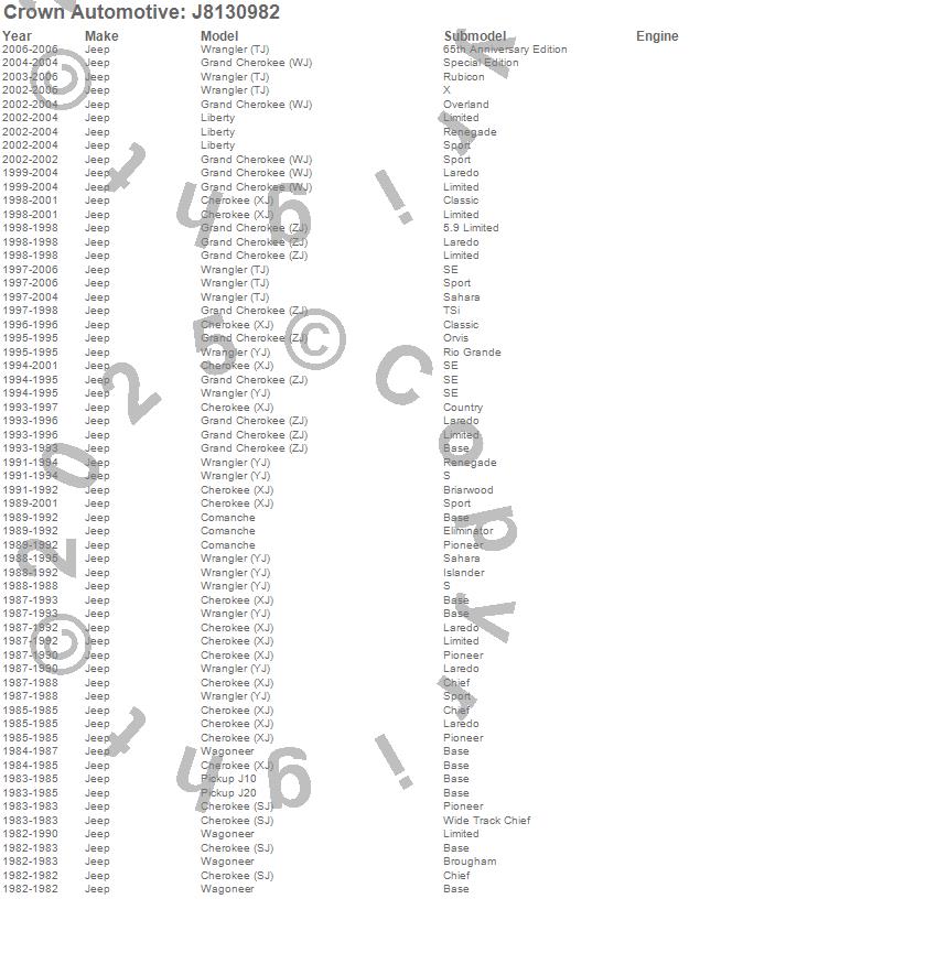 Crown Automotive is the premier manufacturer and distributor of quality replacement parts for Jeep® CJ™, Wrangler™, Cherokee™, Grand Cherokee™, Liberty™, and Commander™."From humble beginnings in 1963 in a small Boston storefront, Crown Automotive has consistently maintained its commitment to offering only quality parts and exceptional service. Today, with warehouses in Massachusetts, Georgia, Nevada, Spain, and the Czech Republic, totaling over 160,000 square feet, Crown Automotive continues to be the leader in quality replacement parts for Jeep® vehicles. With over 8,000 different parts in stock for Jeep® vehicles from 1942 on up, Crown has the largest stock of replacement parts for Jeep® vehicles, including factory-discontinued parts. In fact, many of the older Jeeps are still on (and off) the road thanks to Crown parts. The Crown line consists of axle, body, brake, clutch, cooling, driveline, electrical, engine, exhaust, fuel, steering, suspension, transmission and transfer case components. Crown Automotive also offers an exclusive line of component kits and accessory products. Because we know that Jeeps are driven harder than most other vehicles, we emphasize offering only quality parts. In fact, we test parts on Jeeps before distributing them to our dealers to insure that they meet our standards for quality. Crown also supports its entire line with a 12 month/12,000 mile warranty to insure our dealers and their customers of our commitment to offering quality parts. We know from experience that Jeep® owners would rather pay a little more for a good quality part that's backed by a strong guarantee. But we know that price is important as well. So, not only will you find Crown parts to be of exceptional quality, but you'll find them at a great price too.