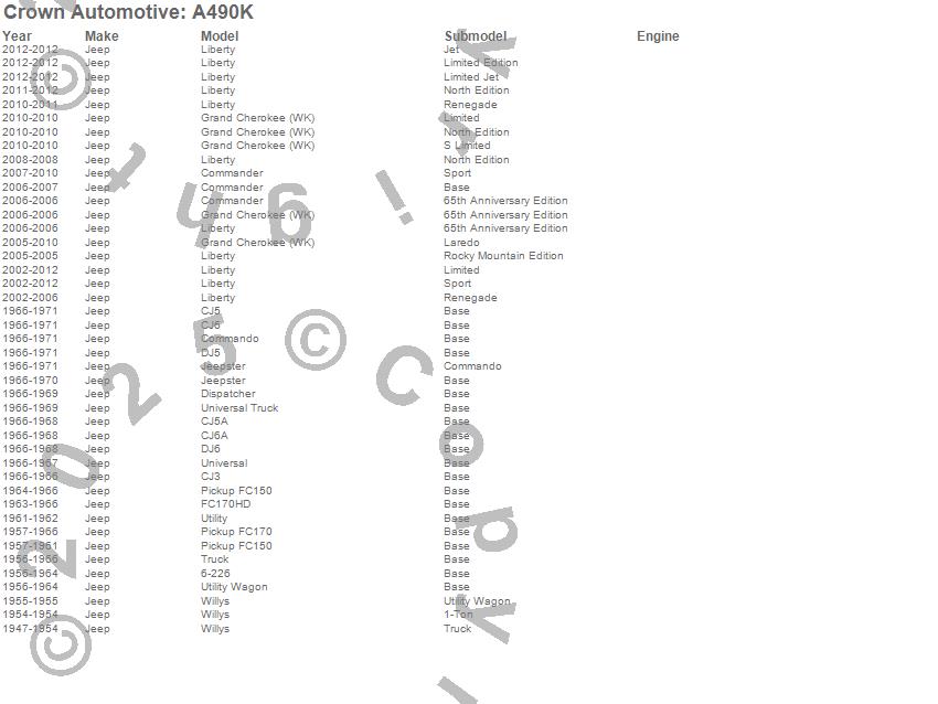 1-Ton Pickup, 6-226, CJ3, CJ5, CJ5A, CJ6, CJ6A, Commander, Commando, Dispatcher, DJ5, DJ5A, DJ6, FC150, FC170, FC170HD, Grand Cherokee (WK), Jeepster, Liberty, Truck more…