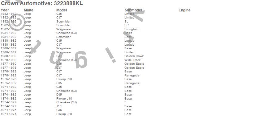 Crown Automotive is the premier manufacturer and distributor of quality replacement parts for Jeep® CJ™, Wrangler™, Cherokee™, Grand Cherokee™, Liberty™, and Commander™."From humble beginnings in 1963 in a small Boston storefront, Crown Automotive has consistently maintained its commitment to offering only quality parts and exceptional service. Today, with warehouses in Massachusetts, Georgia, Nevada, Spain, and the Czech Republic, totaling over 160,000 square feet, Crown Automotive continues to be the leader in quality replacement parts for Jeep® vehicles. With over 8,000 different parts in stock for Jeep® vehicles from 1942 on up, Crown has the largest stock of replacement parts for Jeep® vehicles, including factory-discontinued parts. In fact, many of the older Jeeps are still on (and off) the road thanks to Crown parts. The Crown line consists of axle, body, brake, clutch, cooling, driveline, electrical, engine, exhaust, fuel, steering, suspension, transmission and transfer case components. Crown Automotive also offers an exclusive line of component kits and accessory products. Because we know that Jeeps are driven harder than most other vehicles, we emphasize offering only quality parts. In fact, we test parts on Jeeps before distributing them to our dealers to insure that they meet our standards for quality. Crown also supports its entire line with a 12 month/12,000 mile warranty to insure our dealers and their customers of our commitment to offering quality parts. We know from experience that Jeep® owners would rather pay a little more for a good quality part that's backed by a strong guarantee. But we know that price is important as well. So, not only will you find Crown parts to be of exceptional quality, but you'll find them at a great price too.