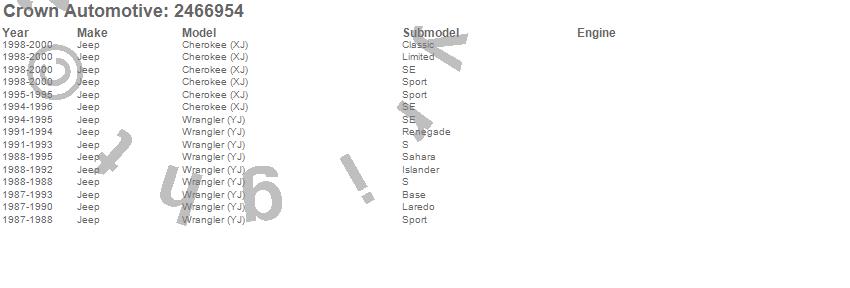 Crown Automotive is the premier manufacturer and distributor of quality replacement parts for Jeep® CJ™, Wrangler™, Cherokee™, Grand Cherokee™, Liberty™, and Commander™."From humble beginnings in 1963 in a small Boston storefront, Crown Automotive has consistently maintained its commitment to offering only quality parts and exceptional service. Today, with warehouses in Massachusetts, Georgia, Nevada, Spain, and the Czech Republic, totaling over 160,000 square feet, Crown Automotive continues to be the leader in quality replacement parts for Jeep® vehicles. With over 8,000 different parts in stock for Jeep® vehicles from 1942 on up, Crown has the largest stock of replacement parts for Jeep® vehicles, including factory-discontinued parts. In fact, many of the older Jeeps are still on (and off) the road thanks to Crown parts. The Crown line consists of axle, body, brake, clutch, cooling, driveline, electrical, engine, exhaust, fuel, steering, suspension, transmission and transfer case components. Crown Automotive also offers an exclusive line of component kits and accessory products. Because we know that Jeeps are driven harder than most other vehicles, we emphasize offering only quality parts. In fact, we test parts on Jeeps before distributing them to our dealers to insure that they meet our standards for quality. Crown also supports its entire line with a 12 month/12,000 mile warranty to insure our dealers and their customers of our commitment to offering quality parts. We know from experience that Jeep® owners would rather pay a little more for a good quality part that's backed by a strong guarantee. But we know that price is important as well. So, not only will you find Crown parts to be of exceptional quality, but you'll find them at a great price too.
