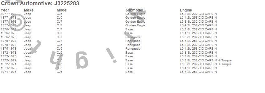 Crown Automotive is the premier manufacturer and distributor of quality replacement parts for Jeep® CJ™, Wrangler™, Cherokee™, Grand Cherokee™, Liberty™, and Commander™."From humble beginnings in 1963 in a small Boston storefront, Crown Automotive has consistently maintained its commitment to offering only quality parts and exceptional service. Today, with warehouses in Massachusetts, Georgia, Nevada, Spain, and the Czech Republic, totaling over 160,000 square feet, Crown Automotive continues to be the leader in quality replacement parts for Jeep® vehicles. With over 8,000 different parts in stock for Jeep® vehicles from 1942 on up, Crown has the largest stock of replacement parts for Jeep® vehicles, including factory-discontinued parts. In fact, many of the older Jeeps are still on (and off) the road thanks to Crown parts. The Crown line consists of axle, body, brake, clutch, cooling, driveline, electrical, engine, exhaust, fuel, steering, suspension, transmission and transfer case components. Crown Automotive also offers an exclusive line of component kits and accessory products. Because we know that Jeeps are driven harder than most other vehicles, we emphasize offering only quality parts. In fact, we test parts on Jeeps before distributing them to our dealers to insure that they meet our standards for quality. Crown also supports its entire line with a 12 month/12,000 mile warranty to insure our dealers and their customers of our commitment to offering quality parts. We know from experience that Jeep® owners would rather pay a little more for a good quality part that's backed by a strong guarantee. But we know that price is important as well. So, not only will you find Crown parts to be of exceptional quality, but you'll find them at a great price too.