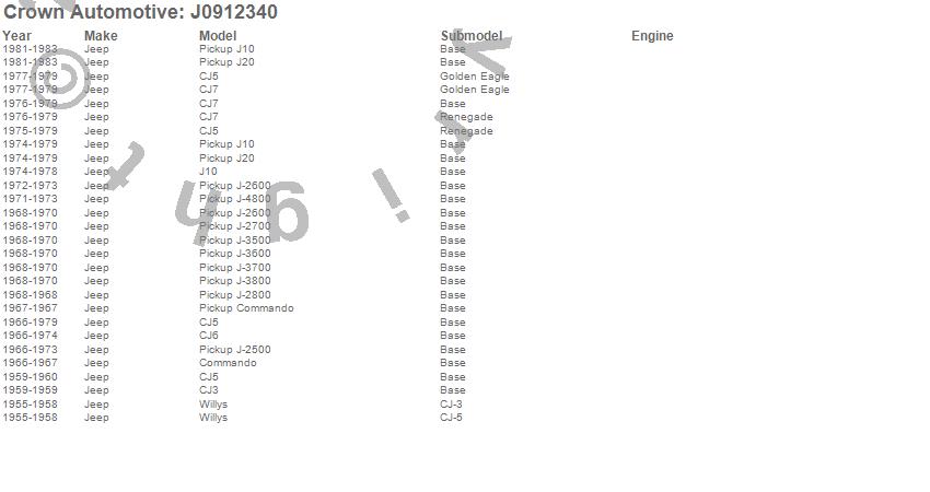 Crown Automotive is the premier manufacturer and distributor of quality replacement parts for Jeep® CJ™, Wrangler™, Cherokee™, Grand Cherokee™, Liberty™, and Commander™."From humble beginnings in 1963 in a small Boston storefront, Crown Automotive has consistently maintained its commitment to offering only quality parts and exceptional service. Today, with warehouses in Massachusetts, Georgia, Nevada, Spain, and the Czech Republic, totaling over 160,000 square feet, Crown Automotive continues to be the leader in quality replacement parts for Jeep® vehicles. With over 8,000 different parts in stock for Jeep® vehicles from 1942 on up, Crown has the largest stock of replacement parts for Jeep® vehicles, including factory-discontinued parts. In fact, many of the older Jeeps are still on (and off) the road thanks to Crown parts. The Crown line consists of axle, body, brake, clutch, cooling, driveline, electrical, engine, exhaust, fuel, steering, suspension, transmission and transfer case components. Crown Automotive also offers an exclusive line of component kits and accessory products. Because we know that Jeeps are driven harder than most other vehicles, we emphasize offering only quality parts. In fact, we test parts on Jeeps before distributing them to our dealers to insure that they meet our standards for quality. Crown also supports its entire line with a 12 month/12,000 mile warranty to insure our dealers and their customers of our commitment to offering quality parts. We know from experience that Jeep® owners would rather pay a little more for a good quality part that's backed by a strong guarantee. But we know that price is important as well. So, not only will you find Crown parts to be of exceptional quality, but you'll find them at a great price too.