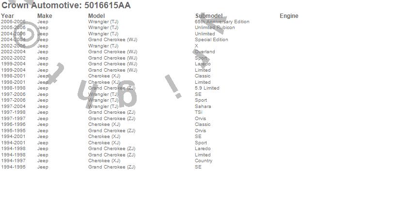 Cherokee (XJ), Grand Cherokee (WJ), Grand Cherokee (ZJ), Wrangler (LJ), Wrangler (TJ), Jeep, 2006, 2005, 2004, 2003, 2002, 2001, 2000, 1999, 1998, 1997, 1996, 1995, 1994 more…