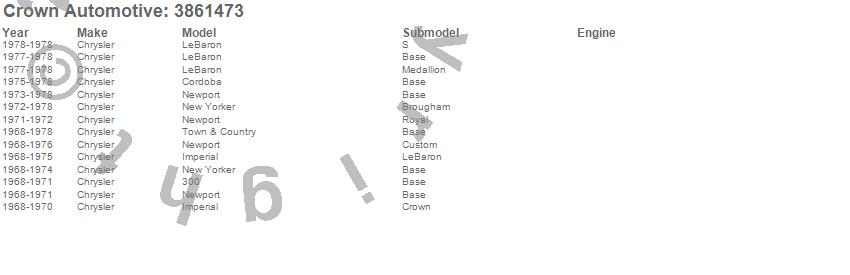 300, Cordoba, Imperial, LeBaron, New Yorker, Newport, Town & Country, Chrysler, 1978, 1977, 1976, 1975, 1974, 1973, 1972, 1971, 1970, 1969, 1968 more…