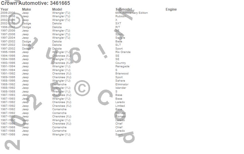 Crown Automotive is the premier manufacturer and distributor of quality replacement parts for Jeep® CJ™, Wrangler™, Cherokee™, Grand Cherokee™, Liberty™, and Commander™."From humble beginnings in 1963 in a small Boston storefront, Crown Automotive has consistently maintained its commitment to offering only quality parts and exceptional service. Today, with warehouses in Massachusetts, Georgia, Nevada, Spain, and the Czech Republic, totaling over 160,000 square feet, Crown Automotive continues to be the leader in quality replacement parts for Jeep® vehicles. With over 8,000 different parts in stock for Jeep® vehicles from 1942 on up, Crown has the largest stock of replacement parts for Jeep® vehicles, including factory-discontinued parts. In fact, many of the older Jeeps are still on (and off) the road thanks to Crown parts. The Crown line consists of axle, body, brake, clutch, cooling, driveline, electrical, engine, exhaust, fuel, steering, suspension, transmission and transfer case components. Crown Automotive also offers an exclusive line of component kits and accessory products. Because we know that Jeeps are driven harder than most other vehicles, we emphasize offering only quality parts. In fact, we test parts on Jeeps before distributing them to our dealers to insure that they meet our standards for quality. Crown also supports its entire line with a 12 month/12,000 mile warranty to insure our dealers and their customers of our commitment to offering quality parts. We know from experience that Jeep® owners would rather pay a little more for a good quality part that's backed by a strong guarantee. But we know that price is important as well. So, not only will you find Crown parts to be of exceptional quality, but you'll find them at a great price too.