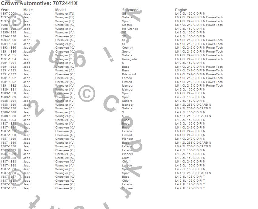 Crown Automotive is the premier manufacturer and distributor of quality replacement parts for Jeep® CJ™, Wrangler™, Cherokee™, Grand Cherokee™, Liberty™, and Commander™."From humble beginnings in 1963 in a small Boston storefront, Crown Automotive has consistently maintained its commitment to offering only quality parts and exceptional service. Today, with warehouses in Massachusetts, Georgia, Nevada, Spain, and the Czech Republic, totaling over 160,000 square feet, Crown Automotive continues to be the leader in quality replacement parts for Jeep® vehicles. With over 8,000 different parts in stock for Jeep® vehicles from 1942 on up, Crown has the largest stock of replacement parts for Jeep® vehicles, including factory-discontinued parts. In fact, many of the older Jeeps are still on (and off) the road thanks to Crown parts. The Crown line consists of axle, body, brake, clutch, cooling, driveline, electrical, engine, exhaust, fuel, steering, suspension, transmission and transfer case components. Crown Automotive also offers an exclusive line of component kits and accessory products. Because we know that Jeeps are driven harder than most other vehicles, we emphasize offering only quality parts. In fact, we test parts on Jeeps before distributing them to our dealers to insure that they meet our standards for quality. Crown also supports its entire line with a 12 month/12,000 mile warranty to insure our dealers and their customers of our commitment to offering quality parts. We know from experience that Jeep® owners would rather pay a little more for a good quality part that's backed by a strong guarantee. But we know that price is important as well. So, not only will you find Crown parts to be of exceptional quality, but you'll find them at a great price too.