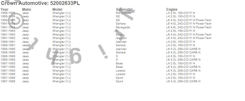 Crown Automotive is the premier manufacturer and distributor of quality replacement parts for Jeep® CJ™, Wrangler™, Cherokee™, Grand Cherokee™, Liberty™, and Commander™."From humble beginnings in 1963 in a small Boston storefront, Crown Automotive has consistently maintained its commitment to offering only quality parts and exceptional service. Today, with warehouses in Massachusetts, Georgia, Nevada, Spain, and the Czech Republic, totaling over 160,000 square feet, Crown Automotive continues to be the leader in quality replacement parts for Jeep® vehicles. With over 8,000 different parts in stock for Jeep® vehicles from 1942 on up, Crown has the largest stock of replacement parts for Jeep® vehicles, including factory-discontinued parts. In fact, many of the older Jeeps are still on (and off) the road thanks to Crown parts. The Crown line consists of axle, body, brake, clutch, cooling, driveline, electrical, engine, exhaust, fuel, steering, suspension, transmission and transfer case components. Crown Automotive also offers an exclusive line of component kits and accessory products. Because we know that Jeeps are driven harder than most other vehicles, we emphasize offering only quality parts. In fact, we test parts on Jeeps before distributing them to our dealers to insure that they meet our standards for quality. Crown also supports its entire line with a 12 month/12,000 mile warranty to insure our dealers and their customers of our commitment to offering quality parts. We know from experience that Jeep® owners would rather pay a little more for a good quality part that's backed by a strong guarantee. But we know that price is important as well. So, not only will you find Crown parts to be of exceptional quality, but you'll find them at a great price too.