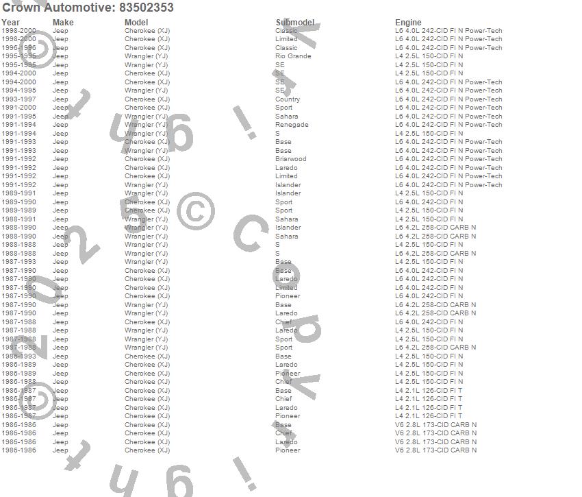 Cherokee (XJ), Wrangler (YJ), Jeep, 2000, 1999, 1998, 1997, 1996, 1995, 1994, 1993, 1992, 1991, 1990, 1989, 1988, 1987, 1986 more…