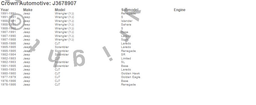 Crown Automotive is the premier manufacturer and distributor of quality replacement parts for Jeep® CJ™, Wrangler™, Cherokee™, Grand Cherokee™, Liberty™, and Commander™."From humble beginnings in 1963 in a small Boston storefront, Crown Automotive has consistently maintained its commitment to offering only quality parts and exceptional service. Today, with warehouses in Massachusetts, Georgia, Nevada, Spain, and the Czech Republic, totaling over 160,000 square feet, Crown Automotive continues to be the leader in quality replacement parts for Jeep® vehicles. With over 8,000 different parts in stock for Jeep® vehicles from 1942 on up, Crown has the largest stock of replacement parts for Jeep® vehicles, including factory-discontinued parts. In fact, many of the older Jeeps are still on (and off) the road thanks to Crown parts. The Crown line consists of axle, body, brake, clutch, cooling, driveline, electrical, engine, exhaust, fuel, steering, suspension, transmission and transfer case components. Crown Automotive also offers an exclusive line of component kits and accessory products. Because we know that Jeeps are driven harder than most other vehicles, we emphasize offering only quality parts. In fact, we test parts on Jeeps before distributing them to our dealers to insure that they meet our standards for quality. Crown also supports its entire line with a 12 month/12,000 mile warranty to insure our dealers and their customers of our commitment to offering quality parts. We know from experience that Jeep® owners would rather pay a little more for a good quality part that's backed by a strong guarantee. But we know that price is important as well. So, not only will you find Crown parts to be of exceptional quality, but you'll find them at a great price too.