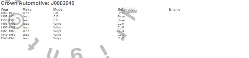 Crown Automotive is the premier manufacturer and distributor of quality replacement parts for Jeep® CJ™, Wrangler™, Cherokee™, Grand Cherokee™, Liberty™, and Commander™."From humble beginnings in 1963 in a small Boston storefront, Crown Automotive has consistently maintained its commitment to offering only quality parts and exceptional service. Today, with warehouses in Massachusetts, Georgia, Nevada, Spain, and the Czech Republic, totaling over 160,000 square feet, Crown Automotive continues to be the leader in quality replacement parts for Jeep® vehicles. With over 8,000 different parts in stock for Jeep® vehicles from 1942 on up, Crown has the largest stock of replacement parts for Jeep® vehicles, including factory-discontinued parts. In fact, many of the older Jeeps are still on (and off) the road thanks to Crown parts. The Crown line consists of axle, body, brake, clutch, cooling, driveline, electrical, engine, exhaust, fuel, steering, suspension, transmission and transfer case components. Crown Automotive also offers an exclusive line of component kits and accessory products. Because we know that Jeeps are driven harder than most other vehicles, we emphasize offering only quality parts. In fact, we test parts on Jeeps before distributing them to our dealers to insure that they meet our standards for quality. Crown also supports its entire line with a 12 month/12,000 mile warranty to insure our dealers and their customers of our commitment to offering quality parts. We know from experience that Jeep® owners would rather pay a little more for a good quality part that's backed by a strong guarantee. But we know that price is important as well. So, not only will you find Crown parts to be of exceptional quality, but you'll find them at a great price too.