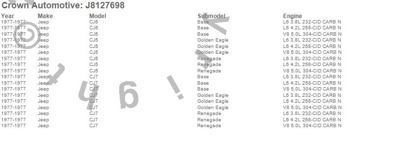 Crown Automotive is the premier manufacturer and distributor of quality replacement parts for Jeep® CJ™, Wrangler™, Cherokee™, Grand Cherokee™, Liberty™, and Commander™."From humble beginnings in 1963 in a small Boston storefront, Crown Automotive has consistently maintained its commitment to offering only quality parts and exceptional service. Today, with warehouses in Massachusetts, Georgia, Nevada, Spain, and the Czech Republic, totaling over 160,000 square feet, Crown Automotive continues to be the leader in quality replacement parts for Jeep® vehicles. With over 8,000 different parts in stock for Jeep® vehicles from 1942 on up, Crown has the largest stock of replacement parts for Jeep® vehicles, including factory-discontinued parts. In fact, many of the older Jeeps are still on (and off) the road thanks to Crown parts. The Crown line consists of axle, body, brake, clutch, cooling, driveline, electrical, engine, exhaust, fuel, steering, suspension, transmission and transfer case components. Crown Automotive also offers an exclusive line of component kits and accessory products. Because we know that Jeeps are driven harder than most other vehicles, we emphasize offering only quality parts. In fact, we test parts on Jeeps before distributing them to our dealers to insure that they meet our standards for quality. Crown also supports its entire line with a 12 month/12,000 mile warranty to insure our dealers and their customers of our commitment to offering quality parts. We know from experience that Jeep® owners would rather pay a little more for a good quality part that's backed by a strong guarantee. But we know that price is important as well. So, not only will you find Crown parts to be of exceptional quality, but you'll find them at a great price too.