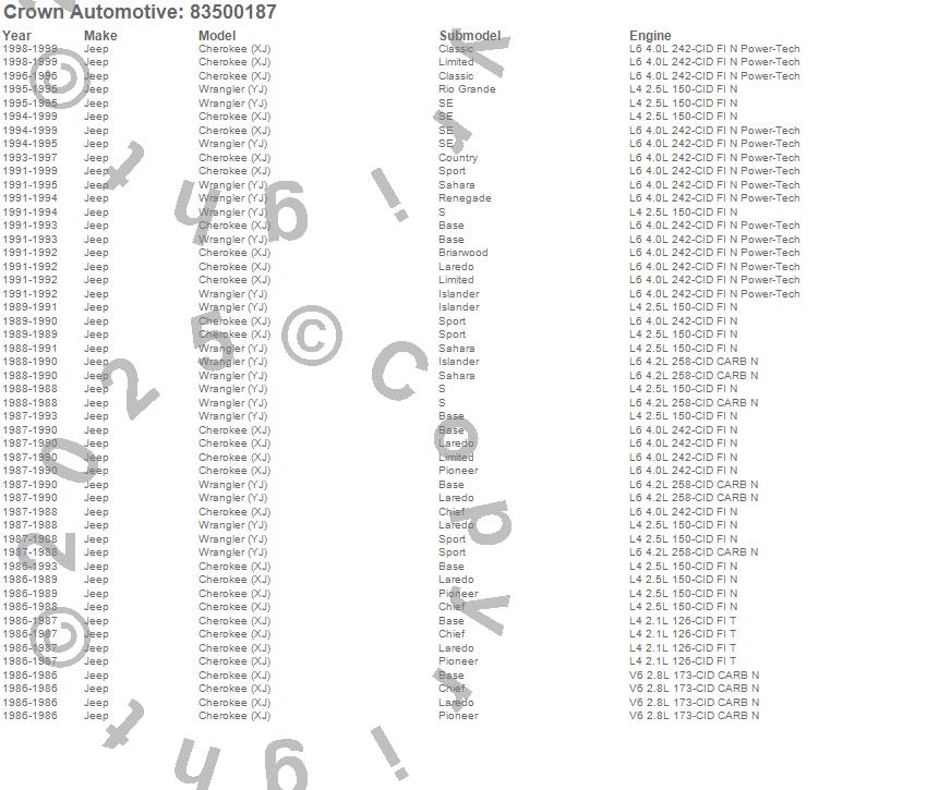 Cherokee (XJ), Wrangler (YJ), Jeep, 1999, 1998, 1997, 1996, 1995, 1994, 1993, 1992, 1991, 1990, 1989, 1988, 1987, 1986 more…