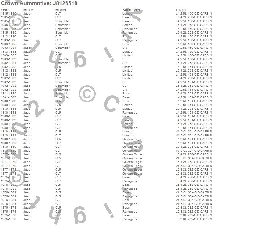 Crown Automotive is the premier manufacturer and distributor of quality replacement parts for Jeep® CJ™, Wrangler™, Cherokee™, Grand Cherokee™, Liberty™, and Commander™."From humble beginnings in 1963 in a small Boston storefront, Crown Automotive has consistently maintained its commitment to offering only quality parts and exceptional service. Today, with warehouses in Massachusetts, Georgia, Nevada, Spain, and the Czech Republic, totaling over 160,000 square feet, Crown Automotive continues to be the leader in quality replacement parts for Jeep® vehicles. With over 8,000 different parts in stock for Jeep® vehicles from 1942 on up, Crown has the largest stock of replacement parts for Jeep® vehicles, including factory-discontinued parts. In fact, many of the older Jeeps are still on (and off) the road thanks to Crown parts. The Crown line consists of axle, body, brake, clutch, cooling, driveline, electrical, engine, exhaust, fuel, steering, suspension, transmission and transfer case components. Crown Automotive also offers an exclusive line of component kits and accessory products. Because we know that Jeeps are driven harder than most other vehicles, we emphasize offering only quality parts. In fact, we test parts on Jeeps before distributing them to our dealers to insure that they meet our standards for quality. Crown also supports its entire line with a 12 month/12,000 mile warranty to insure our dealers and their customers of our commitment to offering quality parts. We know from experience that Jeep® owners would rather pay a little more for a good quality part that's backed by a strong guarantee. But we know that price is important as well. So, not only will you find Crown parts to be of exceptional quality, but you'll find them at a great price too.