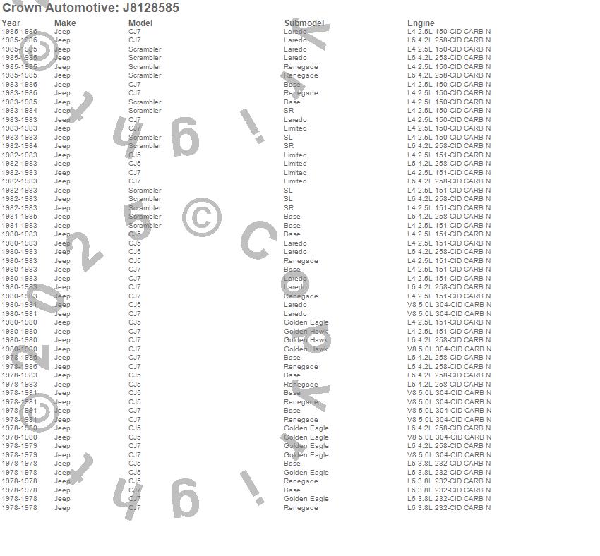 Crown Automotive is the premier manufacturer and distributor of quality replacement parts for Jeep® CJ™, Wrangler™, Cherokee™, Grand Cherokee™, Liberty™, and Commander™."From humble beginnings in 1963 in a small Boston storefront, Crown Automotive has consistently maintained its commitment to offering only quality parts and exceptional service. Today, with warehouses in Massachusetts, Georgia, Nevada, Spain, and the Czech Republic, totaling over 160,000 square feet, Crown Automotive continues to be the leader in quality replacement parts for Jeep® vehicles. With over 8,000 different parts in stock for Jeep® vehicles from 1942 on up, Crown has the largest stock of replacement parts for Jeep® vehicles, including factory-discontinued parts. In fact, many of the older Jeeps are still on (and off) the road thanks to Crown parts. The Crown line consists of axle, body, brake, clutch, cooling, driveline, electrical, engine, exhaust, fuel, steering, suspension, transmission and transfer case components. Crown Automotive also offers an exclusive line of component kits and accessory products. Because we know that Jeeps are driven harder than most other vehicles, we emphasize offering only quality parts. In fact, we test parts on Jeeps before distributing them to our dealers to insure that they meet our standards for quality. Crown also supports its entire line with a 12 month/12,000 mile warranty to insure our dealers and their customers of our commitment to offering quality parts. We know from experience that Jeep® owners would rather pay a little more for a good quality part that's backed by a strong guarantee. But we know that price is important as well. So, not only will you find Crown parts to be of exceptional quality, but you'll find them at a great price too.