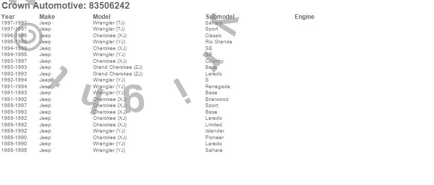 Cherokee (XJ), Grand Cherokee (ZJ), Wrangler (TJ), Wrangler (YJ), Jeep, 1999, 1998, 1997, 1996, 1995, 1994, 1993, 1992, 1991, 1990, 1989, 1988 more…