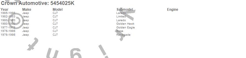 Crown Automotive is the premier manufacturer and distributor of quality replacement parts for Jeep® CJ™, Wrangler™, Cherokee™, Grand Cherokee™, Liberty™, and Commander™."From humble beginnings in 1963 in a small Boston storefront, Crown Automotive has consistently maintained its commitment to offering only quality parts and exceptional service. Today, with warehouses in Massachusetts, Georgia, Nevada, Spain, and the Czech Republic, totaling over 160,000 square feet, Crown Automotive continues to be the leader in quality replacement parts for Jeep® vehicles. With over 8,000 different parts in stock for Jeep® vehicles from 1942 on up, Crown has the largest stock of replacement parts for Jeep® vehicles, including factory-discontinued parts. In fact, many of the older Jeeps are still on (and off) the road thanks to Crown parts. The Crown line consists of axle, body, brake, clutch, cooling, driveline, electrical, engine, exhaust, fuel, steering, suspension, transmission and transfer case components. Crown Automotive also offers an exclusive line of component kits and accessory products. Because we know that Jeeps are driven harder than most other vehicles, we emphasize offering only quality parts. In fact, we test parts on Jeeps before distributing them to our dealers to insure that they meet our standards for quality. Crown also supports its entire line with a 12 month/12,000 mile warranty to insure our dealers and their customers of our commitment to offering quality parts. We know from experience that Jeep® owners would rather pay a little more for a good quality part that's backed by a strong guarantee. But we know that price is important as well. So, not only will you find Crown parts to be of exceptional quality, but you'll find them at a great price too.