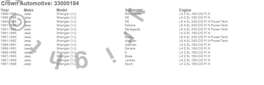 Crown Automotive is the premier manufacturer and distributor of quality replacement parts for Jeep® CJ™, Wrangler™, Cherokee™, Grand Cherokee™, Liberty™, and Commander™."From humble beginnings in 1963 in a small Boston storefront, Crown Automotive has consistently maintained its commitment to offering only quality parts and exceptional service. Today, with warehouses in Massachusetts, Georgia, Nevada, Spain, and the Czech Republic, totaling over 160,000 square feet, Crown Automotive continues to be the leader in quality replacement parts for Jeep® vehicles. With over 8,000 different parts in stock for Jeep® vehicles from 1942 on up, Crown has the largest stock of replacement parts for Jeep® vehicles, including factory-discontinued parts. In fact, many of the older Jeeps are still on (and off) the road thanks to Crown parts. The Crown line consists of axle, body, brake, clutch, cooling, driveline, electrical, engine, exhaust, fuel, steering, suspension, transmission and transfer case components. Crown Automotive also offers an exclusive line of component kits and accessory products. Because we know that Jeeps are driven harder than most other vehicles, we emphasize offering only quality parts. In fact, we test parts on Jeeps before distributing them to our dealers to insure that they meet our standards for quality. Crown also supports its entire line with a 12 month/12,000 mile warranty to insure our dealers and their customers of our commitment to offering quality parts. We know from experience that Jeep® owners would rather pay a little more for a good quality part that's backed by a strong guarantee. But we know that price is important as well. So, not only will you find Crown parts to be of exceptional quality, but you'll find them at a great price too.