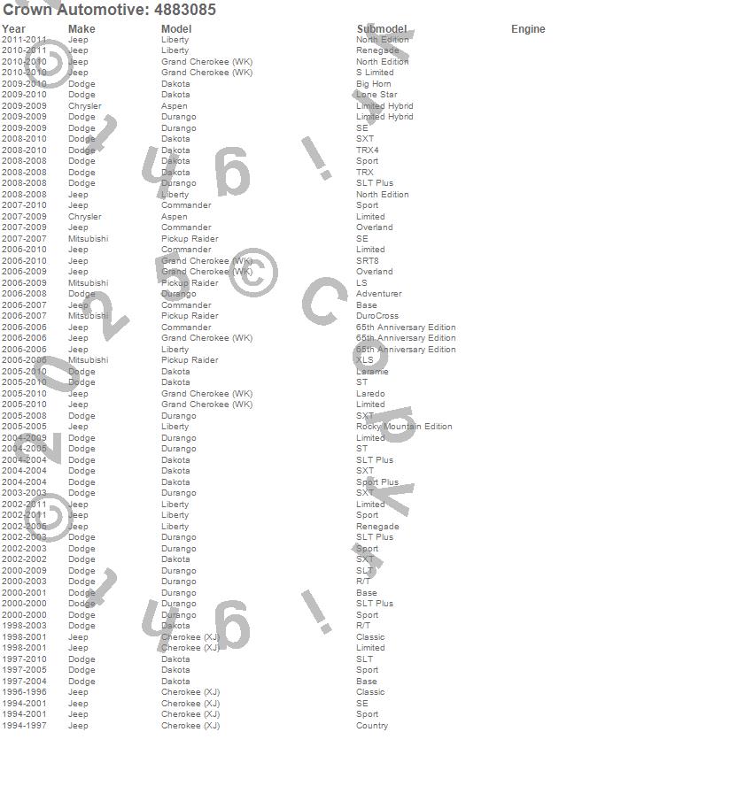 Aspen, Cherokee (XJ), Commander, Dakota, Durango, Grand Cherokee (WK), Liberty, Raider, Chrysler, Dodge, Jeep, Mitsubishi, 2011, 2010, 2009, 2008, 2007, 2006, 2005, 2004 more…