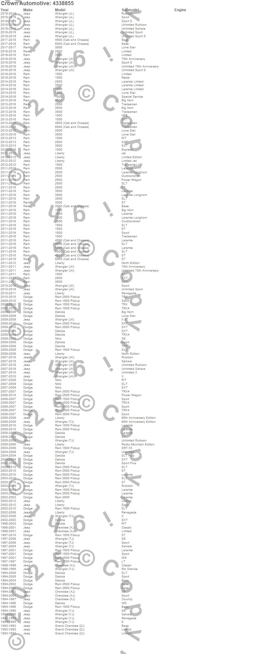 1500, 2500, 3500, Cherokee (XJ), Dakota, Grand Cherokee (ZJ), Liberty, Nitro, Ram 1500, Ram 2500, Ram 3500, Wrangler (JK), Wrangler (LJ), Wrangler (TJ), Wrangler (YJ), Dodge, Jeep, Ram, 2016, 2015 more…
