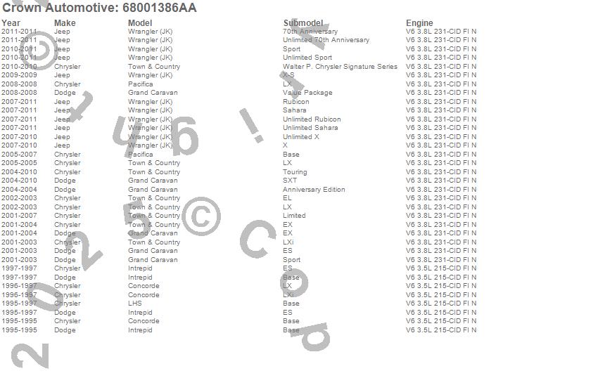 Concorde, Grand Caravan, Intrepid, LHS, Pacifica, Town & Country, Wrangler (JK), Chrysler, Dodge, Jeep, 2011, 2010, 2009, 2008, 2007, 2006, 2005, 2004, 2003, 2002 more…