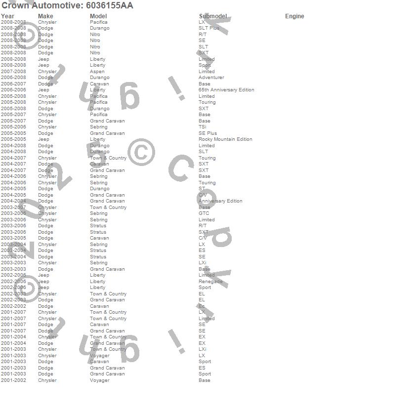 Aspen, Caravan, Durango, Grand Caravan, Liberty, Nitro, Pacifica, Sebring, Stratus, Town & Country, Voyager, Chrysler, Dodge, Jeep, 2008, 2007, 2006, 2005, 2004, 2003 more…