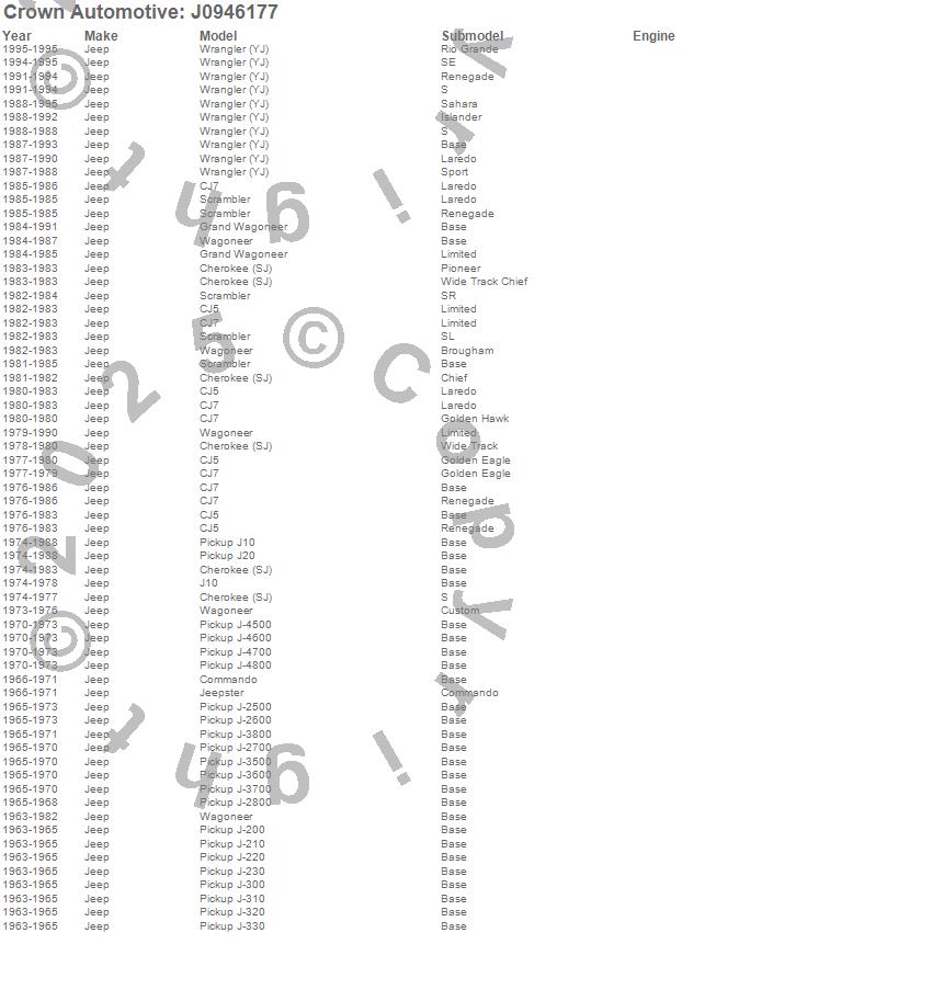Cherokee (SJ), CJ5, CJ7, Commando, Grand Wagoneer, J-200, J-210, J-220, J-230, J-2500, J-2600, J-2700, J-2800, J-300, J-310, J-320, J-330, J-3500, J-3600, J-3700 more…