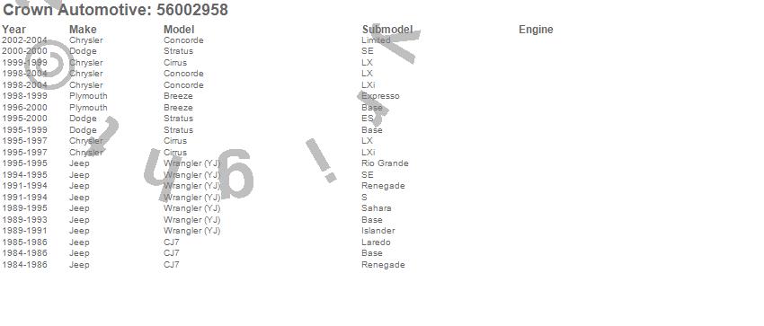 Breeze, Cirrus, CJ7, Concorde, Stratus, Wrangler (YJ), Chrysler, Dodge, Jeep, Plymouth, 2004, 2003, 2002, 2001, 2000, 1999, 1998, 1997, 1996, 1995 more…