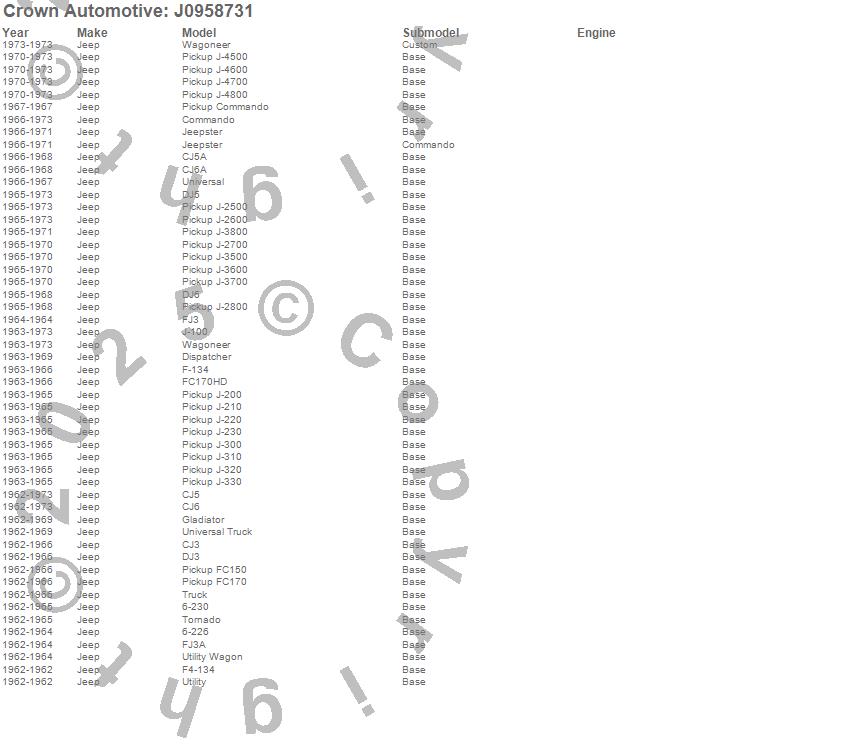 6-226, 6-230, CJ3, CJ5, CJ5A, CJ6, CJ6A, Commando, Dispatcher, DJ-3A, DJ3, DJ5, DJ5A, DJ5B, DJ5C, DJ6, F-134, F4-134, FC150, FC170 more…