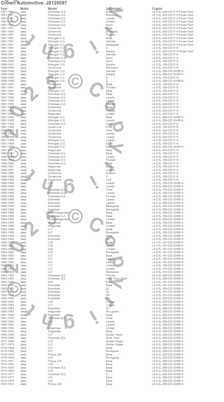 Crown Automotive is the premier manufacturer and distributor of quality replacement parts for Jeep® CJ™, Wrangler™, Cherokee™, Grand Cherokee™, Liberty™, and Commander™."From humble beginnings in 1963 in a small Boston storefront, Crown Automotive has consistently maintained its commitment to offering only quality parts and exceptional service. Today, with warehouses in Massachusetts, Georgia, Nevada, Spain, and the Czech Republic, totaling over 160,000 square feet, Crown Automotive continues to be the leader in quality replacement parts for Jeep® vehicles. With over 8,000 different parts in stock for Jeep® vehicles from 1942 on up, Crown has the largest stock of replacement parts for Jeep® vehicles, including factory-discontinued parts. In fact, many of the older Jeeps are still on (and off) the road thanks to Crown parts. The Crown line consists of axle, body, brake, clutch, cooling, driveline, electrical, engine, exhaust, fuel, steering, suspension, transmission and transfer case components. Crown Automotive also offers an exclusive line of component kits and accessory products. Because we know that Jeeps are driven harder than most other vehicles, we emphasize offering only quality parts. In fact, we test parts on Jeeps before distributing them to our dealers to insure that they meet our standards for quality. Crown also supports its entire line with a 12 month/12,000 mile warranty to insure our dealers and their customers of our commitment to offering quality parts. We know from experience that Jeep® owners would rather pay a little more for a good quality part that's backed by a strong guarantee. But we know that price is important as well. So, not only will you find Crown parts to be of exceptional quality, but you'll find them at a great price too.