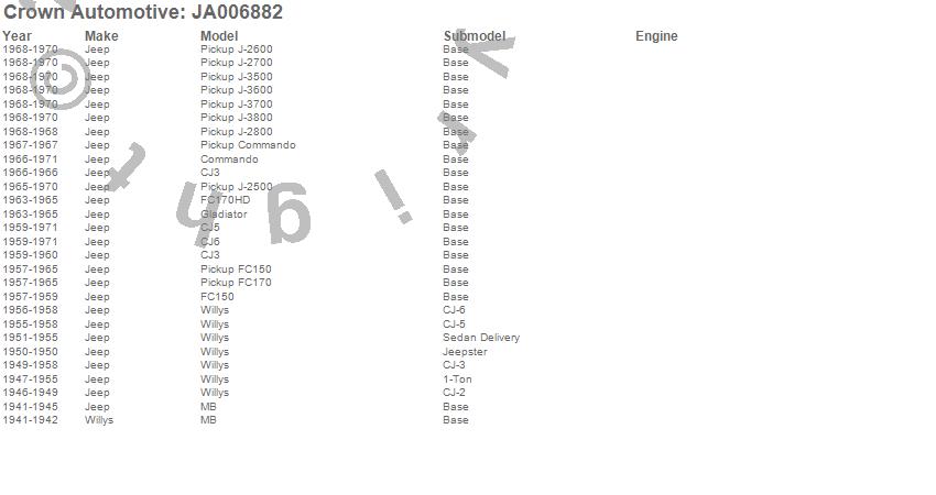1-Ton Pickup, CJ-2A, CJ-3A, CJ-3B, CJ3, CJ5, CJ6, Commando, FC150, FC170, FC170HD, Gladiator, J-2500, J-2600, J-2700, J-2800, J-3500, J-3600, J-3700, J-3800 more…