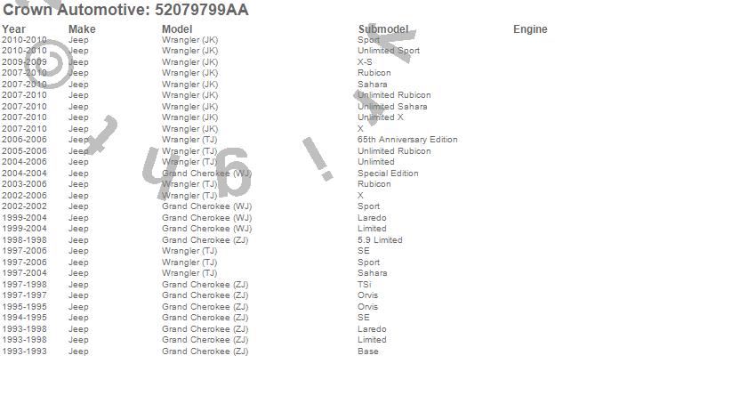Crown Automotive is the premier manufacturer and distributor of quality replacement parts for Jeep® CJ™, Wrangler™, Cherokee™, Grand Cherokee™, Liberty™, and Commander™."From humble beginnings in 1963 in a small Boston storefront, Crown Automotive has consistently maintained its commitment to offering only quality parts and exceptional service. Today, with warehouses in Massachusetts, Georgia, Nevada, Spain, and the Czech Republic, totaling over 160,000 square feet, Crown Automotive continues to be the leader in quality replacement parts for Jeep® vehicles. With over 8,000 different parts in stock for Jeep® vehicles from 1942 on up, Crown has the largest stock of replacement parts for Jeep® vehicles, including factory-discontinued parts. In fact, many of the older Jeeps are still on (and off) the road thanks to Crown parts. The Crown line consists of axle, body, brake, clutch, cooling, driveline, electrical, engine, exhaust, fuel, steering, suspension, transmission and transfer case components. Crown Automotive also offers an exclusive line of component kits and accessory products. Because we know that Jeeps are driven harder than most other vehicles, we emphasize offering only quality parts. In fact, we test parts on Jeeps before distributing them to our dealers to insure that they meet our standards for quality. Crown also supports its entire line with a 12 month/12,000 mile warranty to insure our dealers and their customers of our commitment to offering quality parts. We know from experience that Jeep® owners would rather pay a little more for a good quality part that's backed by a strong guarantee. But we know that price is important as well. So, not only will you find Crown parts to be of exceptional quality, but you'll find them at a great price too.