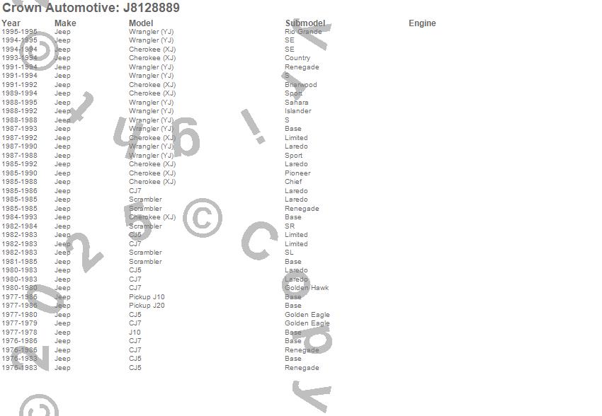 Cherokee (XJ), CJ5, CJ7, J10, J20, Scrambler, Wrangler (YJ), Jeep, 1995, 1994, 1993, 1992, 1991, 1990, 1989, 1988, 1987, 1986, 1985, 1984 more…